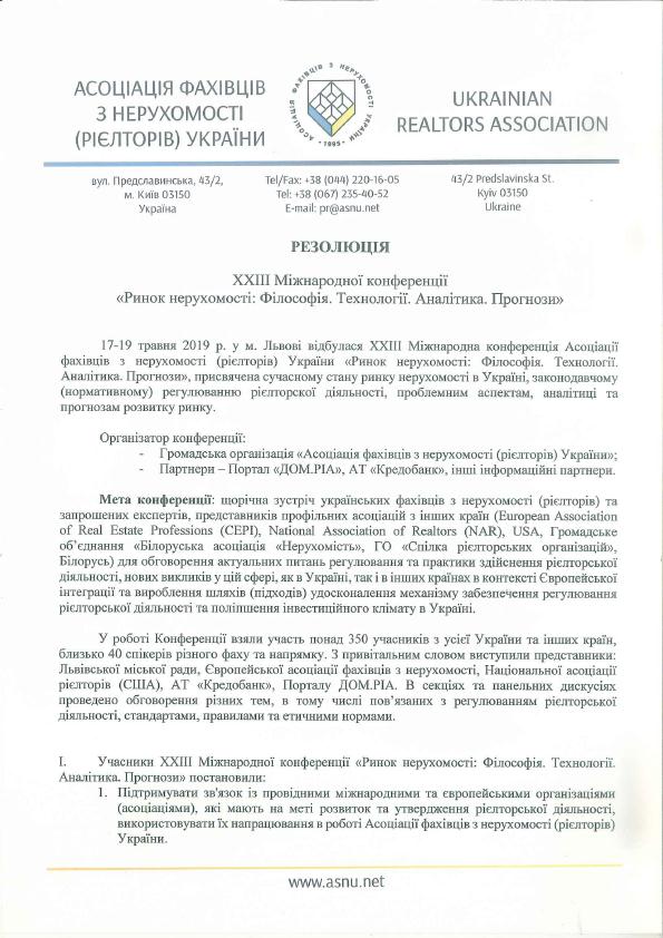 На недавно прошедшей во Львове ХХІІІ Международной конференции по недвижимости АСНУ вопросы разработки профессиональных стандартов и подготовка проекта Закона «О брокерской деятельности в сфере недвижимости» были одними из наиболее обсуждаемых участниками события. В результате была подготовлена официальная Резолюция от имени участников и гостей Конференции, которая уже в ближайшее время будет официально направлена Президенту Украины, Председателю Верховной Рады Украины, Премьер-министру Украины, Главе представительства ЕС в Украине.