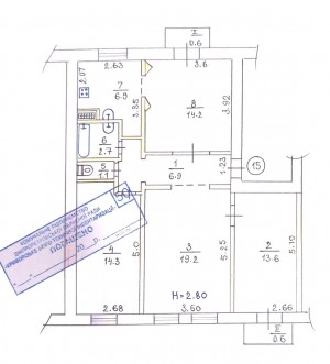 Планування об'єкту: - узаконене перепланування. - вітальня 19.2 м.кв. - спальні кімнати 14.3 + 13.6 м.кв. - столова та кухня 14.2 + 6.9 м.кв. - високі стелі 2.80 м. - маємо 2 балкони. - квартира двостороння.