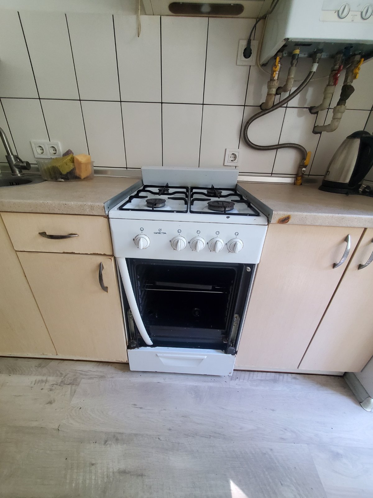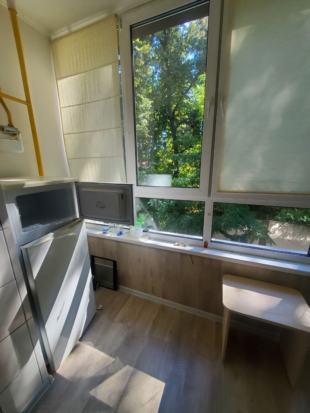 Комплектація меблів та техніки: диван розкладний, обідній стіл, шафа-купе, газова плита, холодильник, витяжка, мийка.