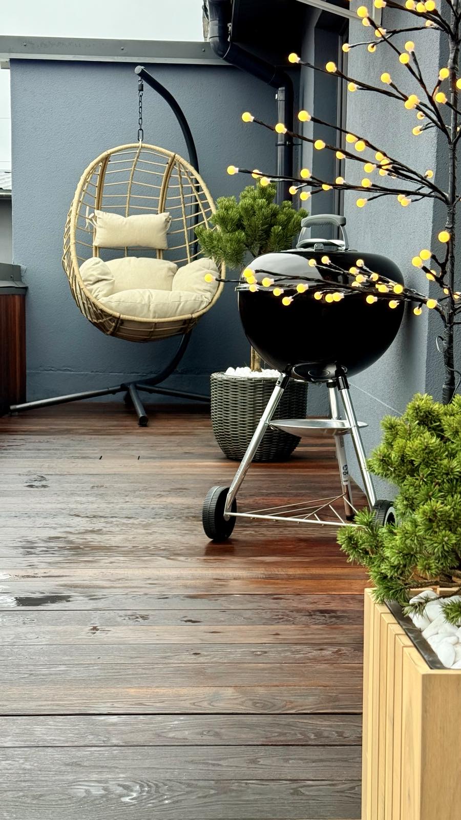 Велика тераса з садовими меблями, барбекю зоною, устелена палубною дошкою.