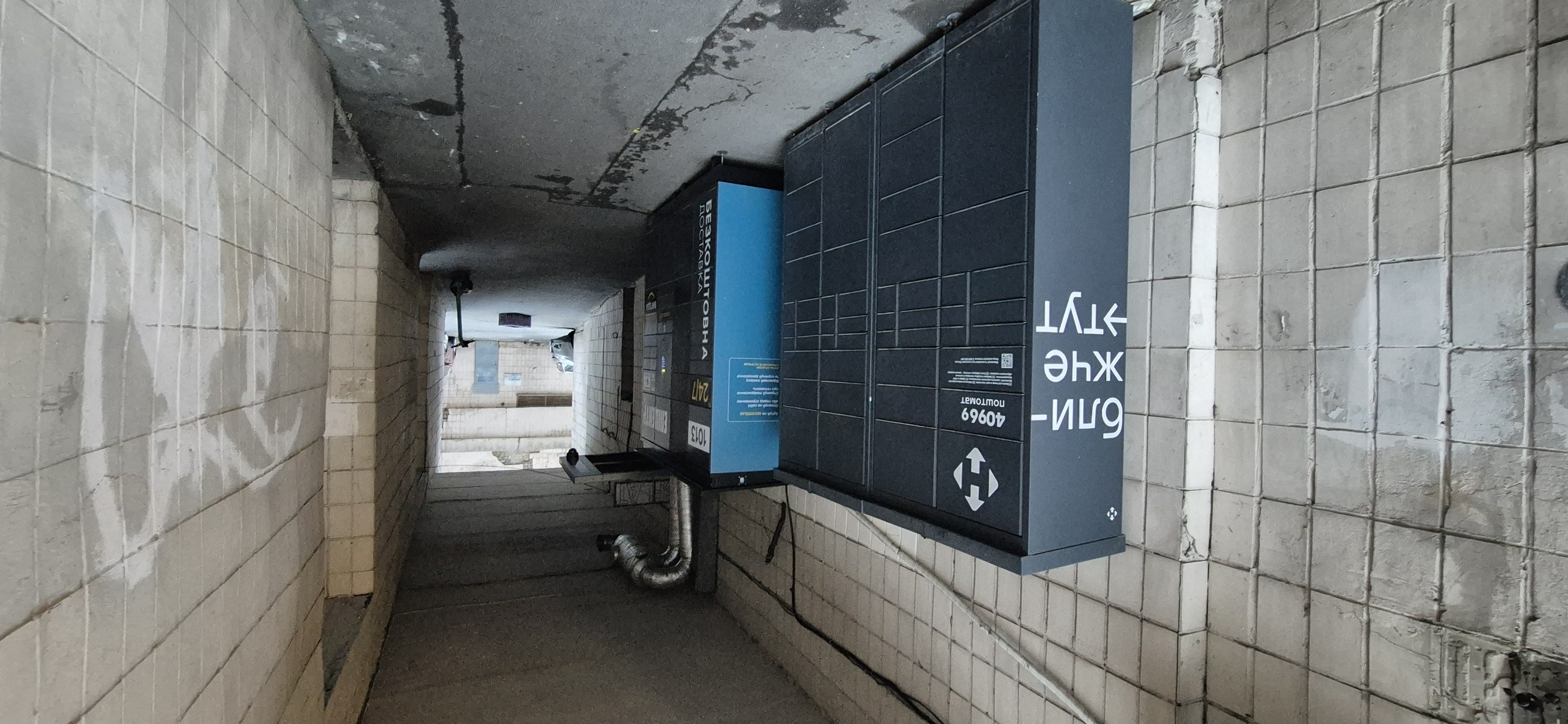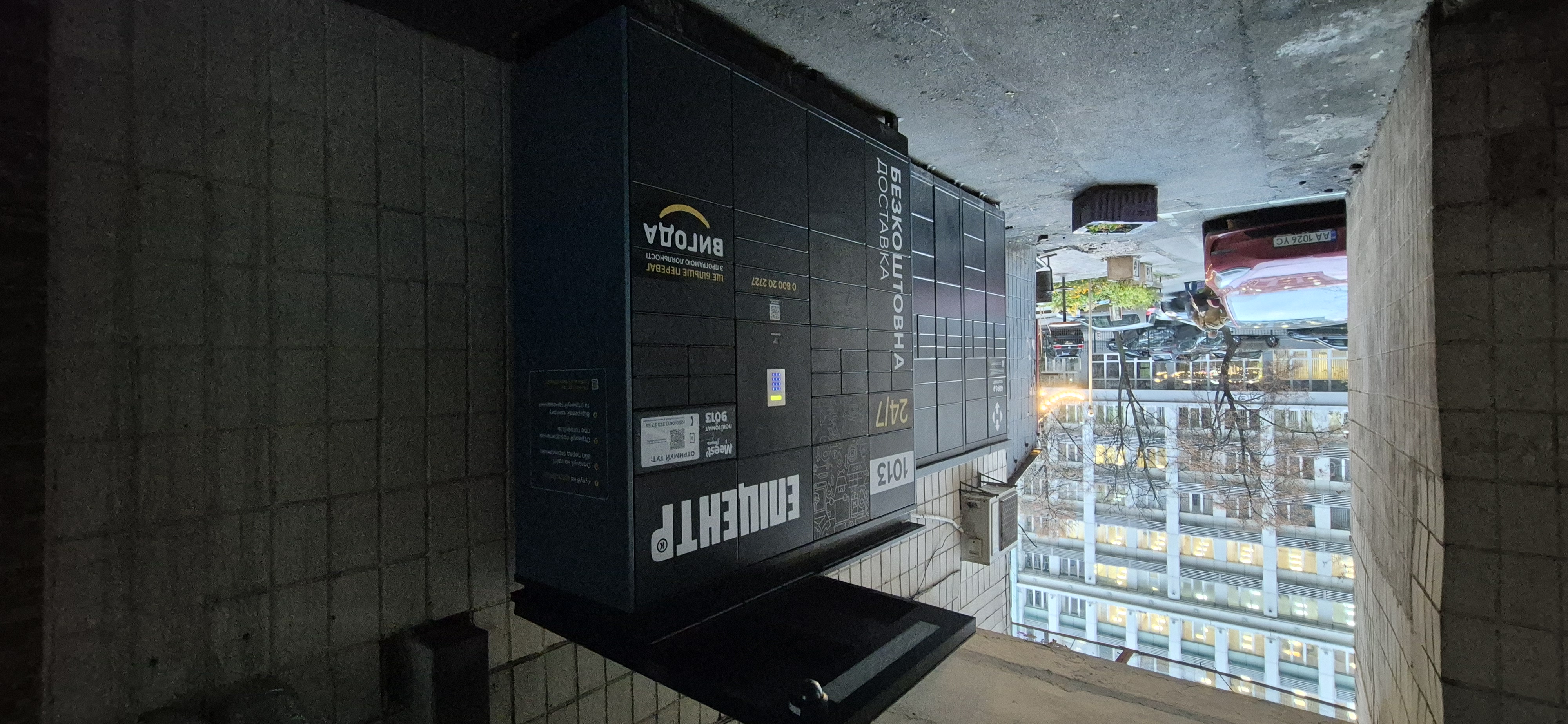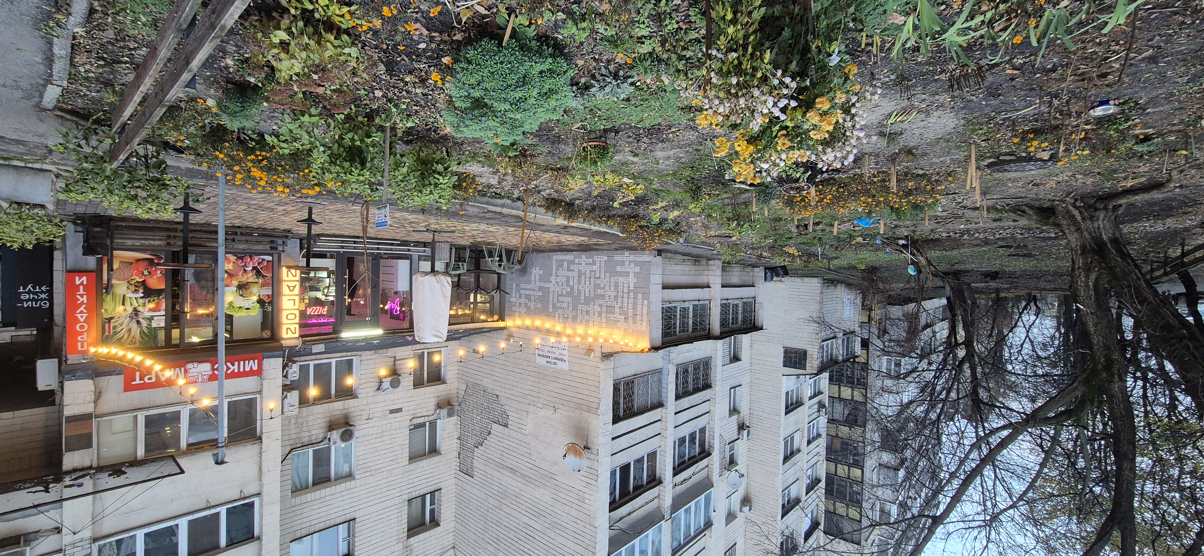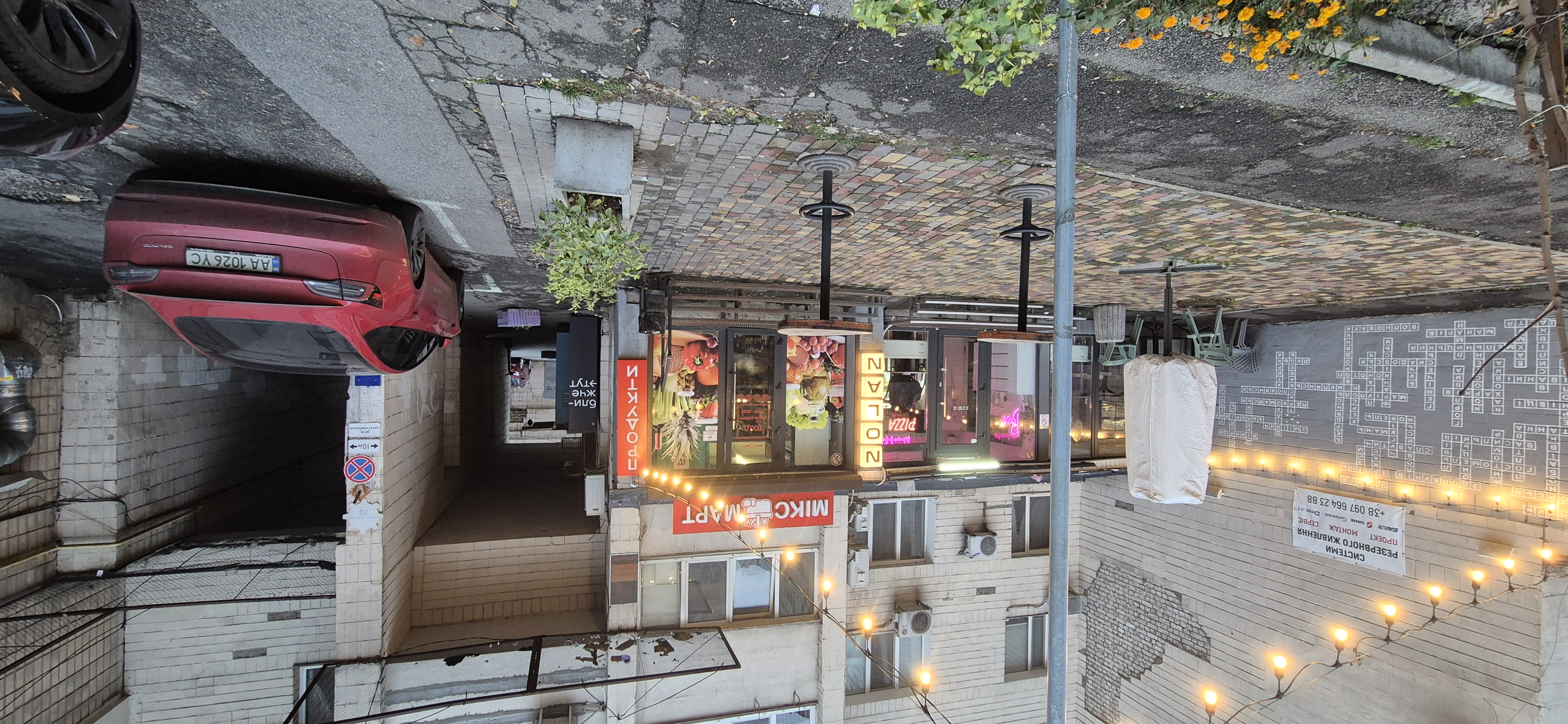 Двір доглянутий, в будику продуктовим магазином Мікс Март, бар, піцерія.