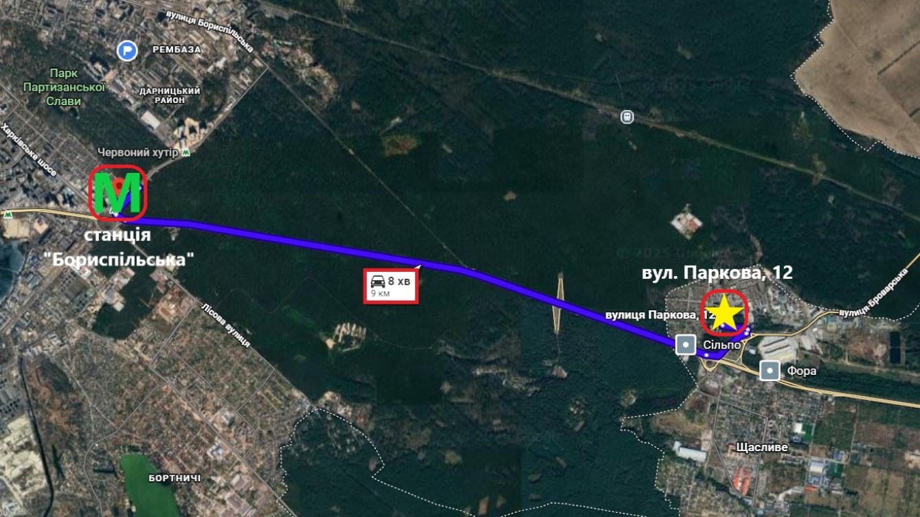 До метро Бориспольської- 8хв. на авто.