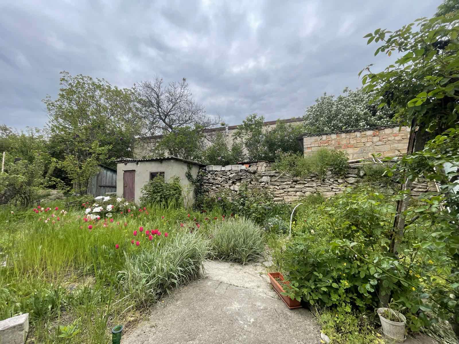 В конце двора небольшой участок земли и хозпостройки.